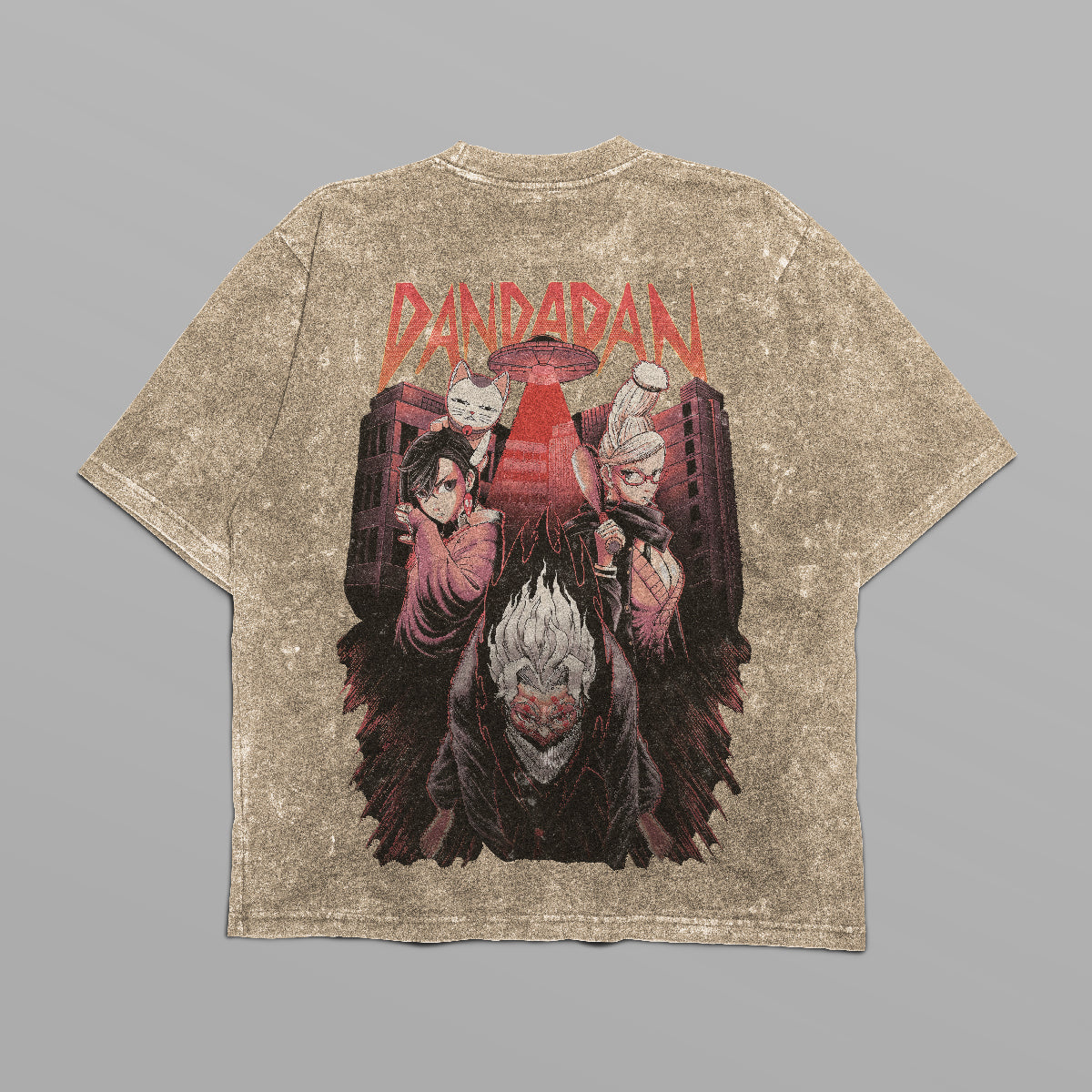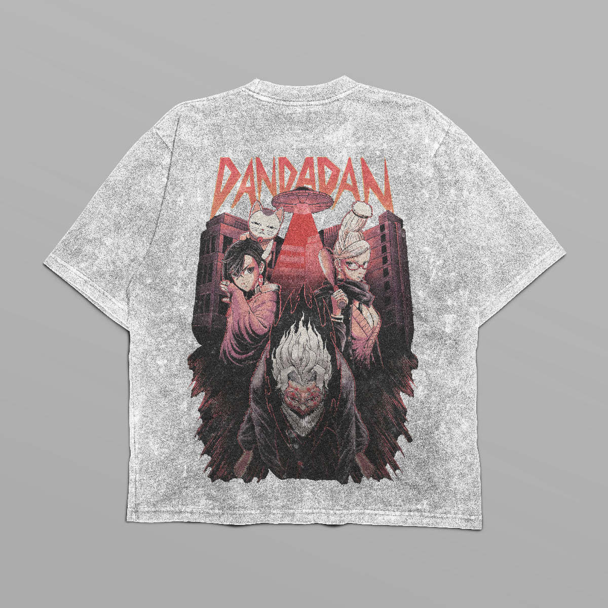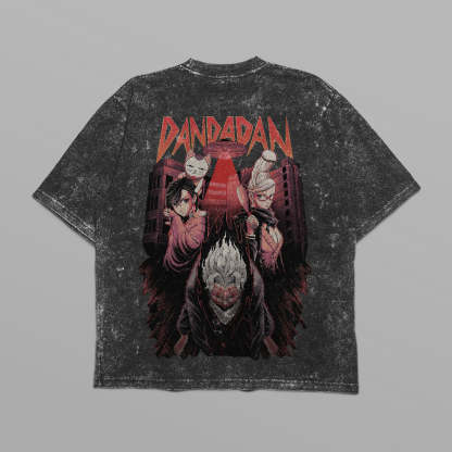Level up your anime-inspired wardrobe with this oversized Dandadan T-shirt! Featuring a bold red Dandadan logo on the front and a detailed, high-definition character group design on the back, this T-shirt perfectly combines subtlety and impact. The back artwork showcases the series’ iconic characters against a dramatic urban backdrop with UFO-inspired vibes, capturing the supernatural energy of the series. Crafted from premium 250 GSM cotton, this T-shirt ensures exceptional comfort, breathability, and durability. Its distressed, vintage-inspired finish and oversized fit make it a perfect streetwear essential for anime fans.