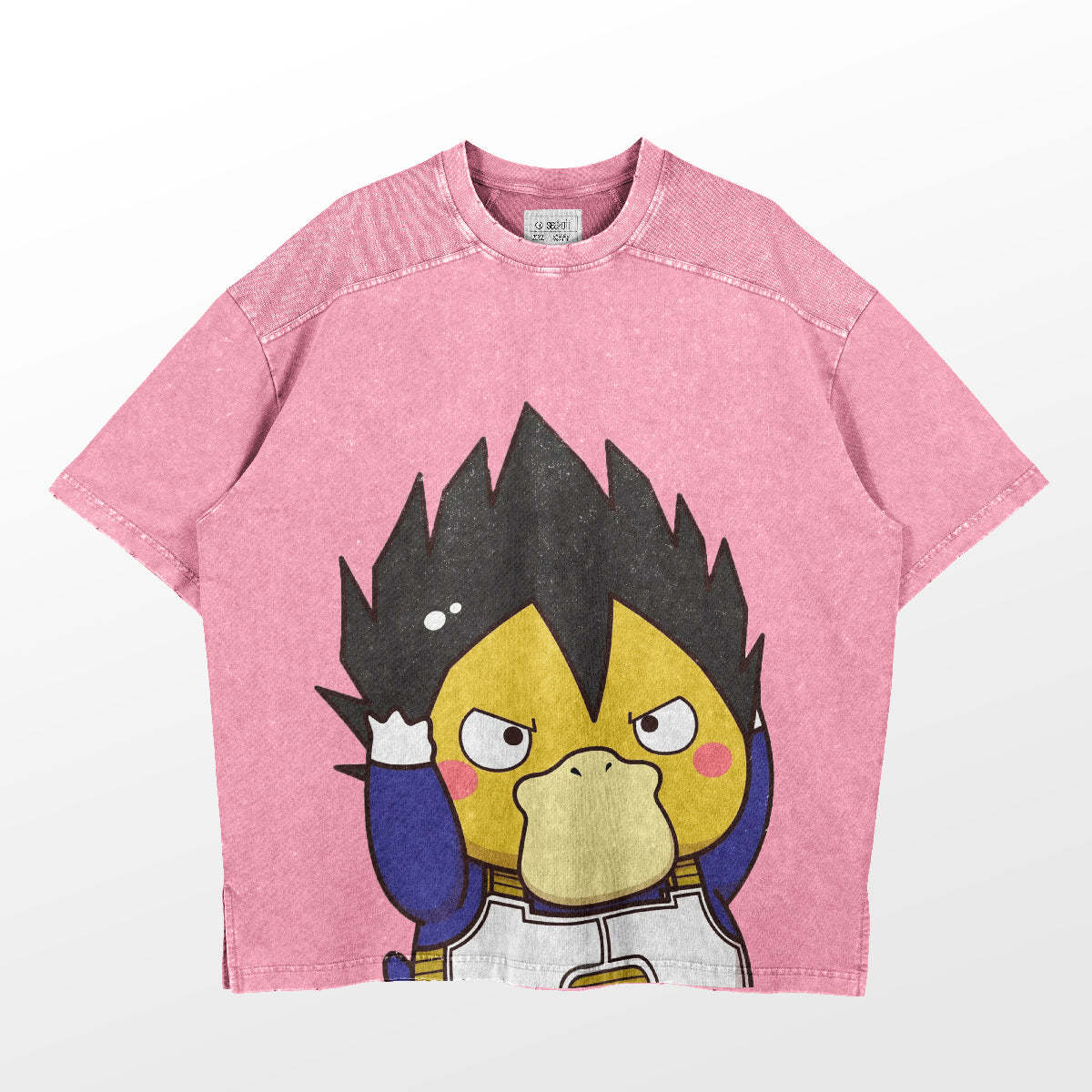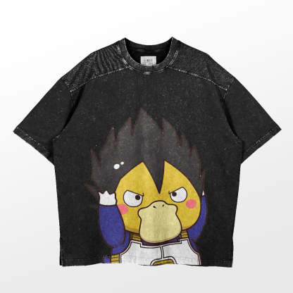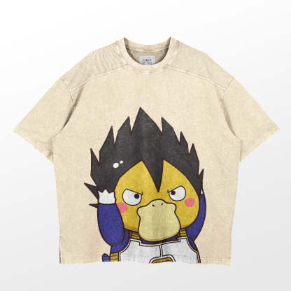 The T-shirt features a playful reinterpretation of Vegeta from Dragon Ball, combining quirky cartoon aesthetics with vintage washed fabric for a standout look. Available in multiple colors, including Vintage Gray, Khaki, Pink, and Black, this shirt caters to a variety of styling needs.